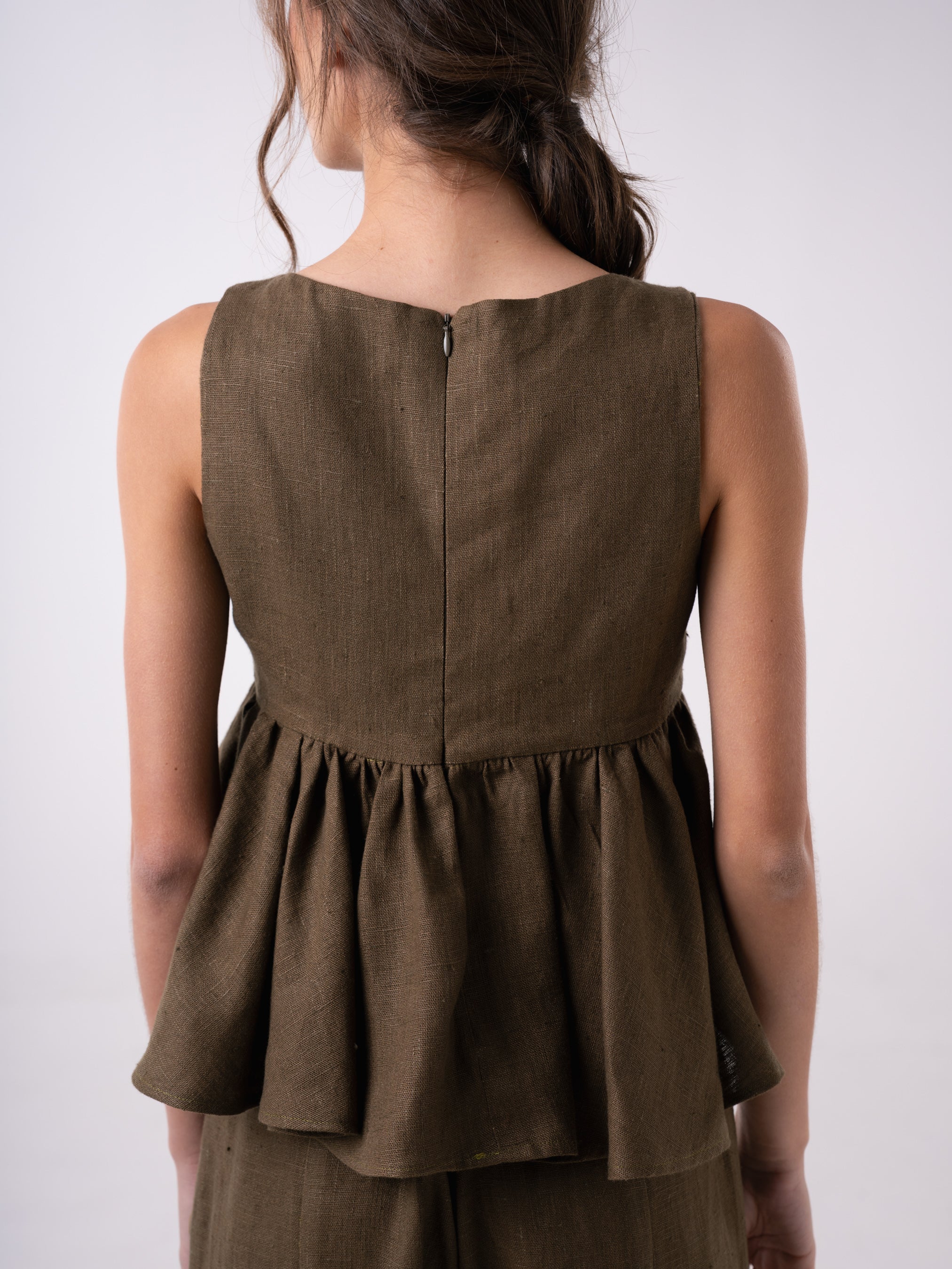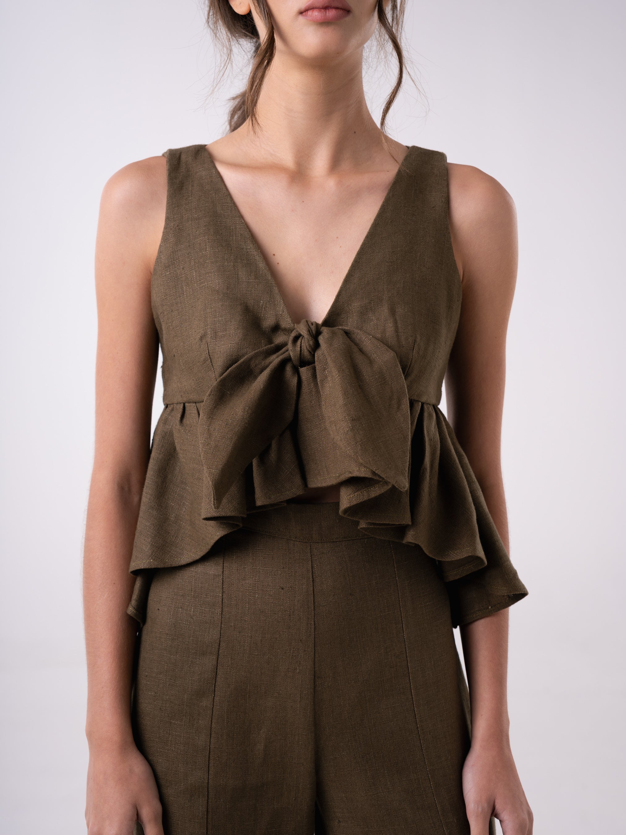 The Arena Top features a V neck empire waist, fit and flare silhouette, with back zipper closure, circular ruffle and knot detail at the front.