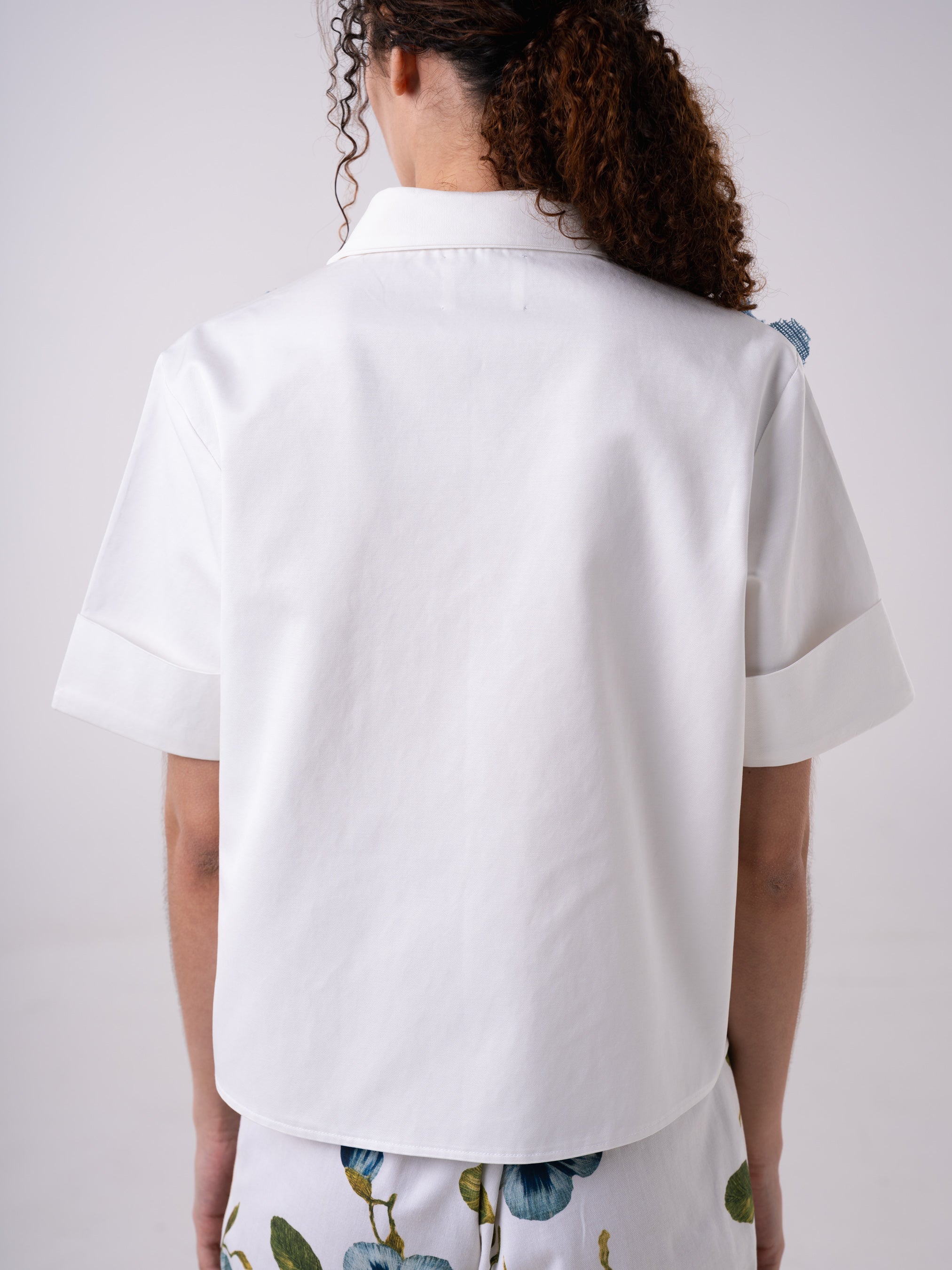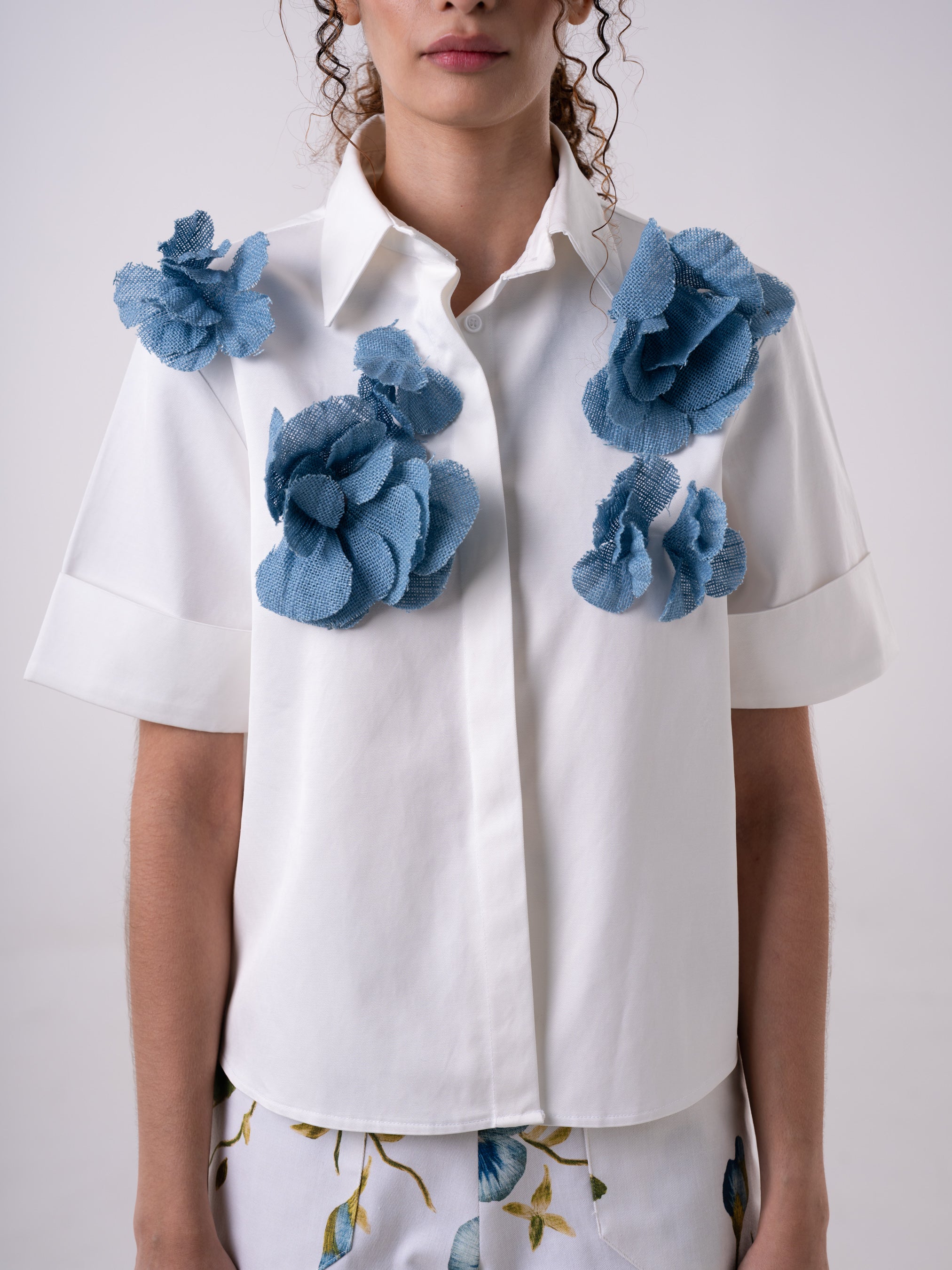 The Cazador Top features a classic button down with short sleeves and cuff detail, elevated by hand sewn artisanal Jute Flowers.