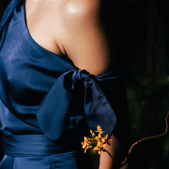 Duarte Top Features a One Shoulder fitted boned top, with back button down closure and removable ruffle straps.