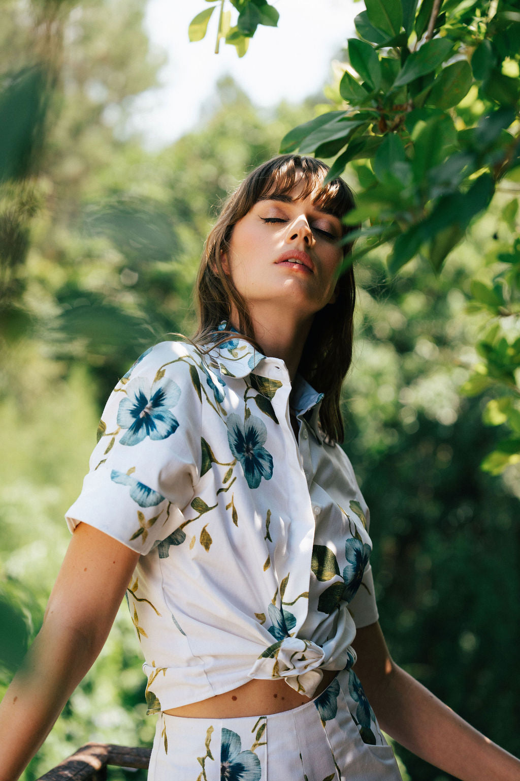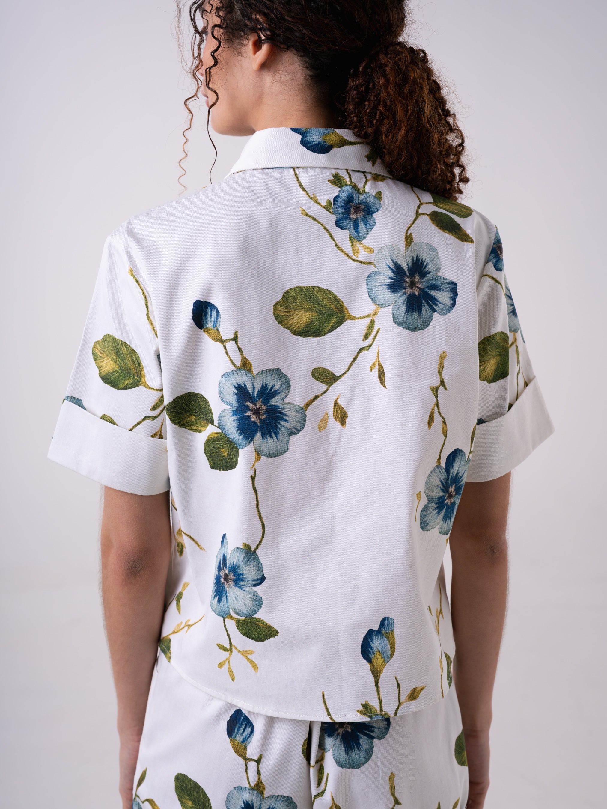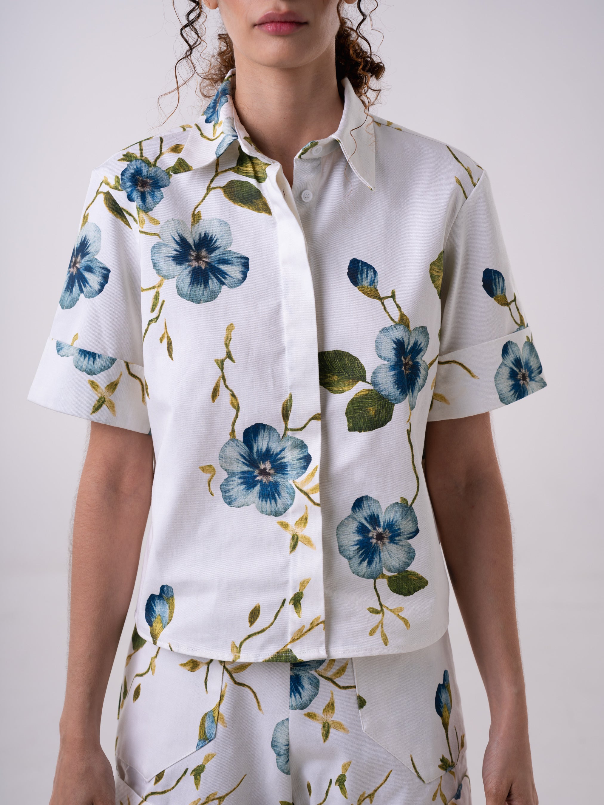 The Infinita Top features a classic button down with short sleeves and cuff detail.