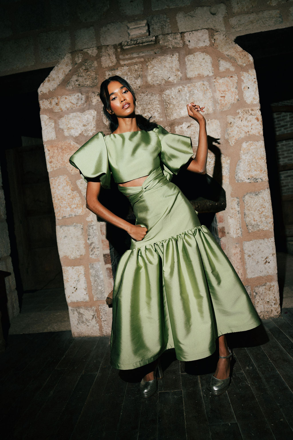 The Libra Skirt features a fit and flare pencil, ankle length silhouette with gathered panel.