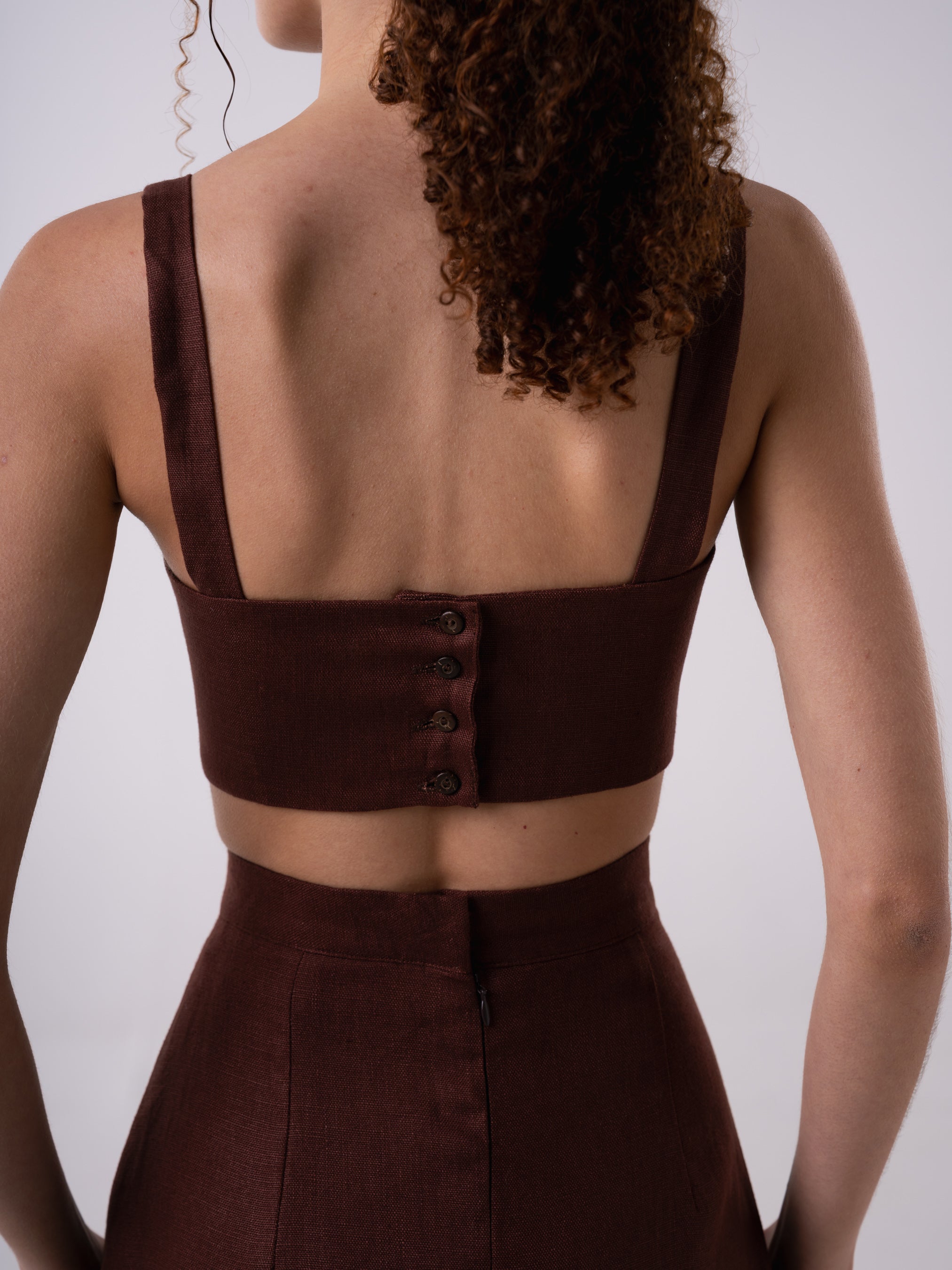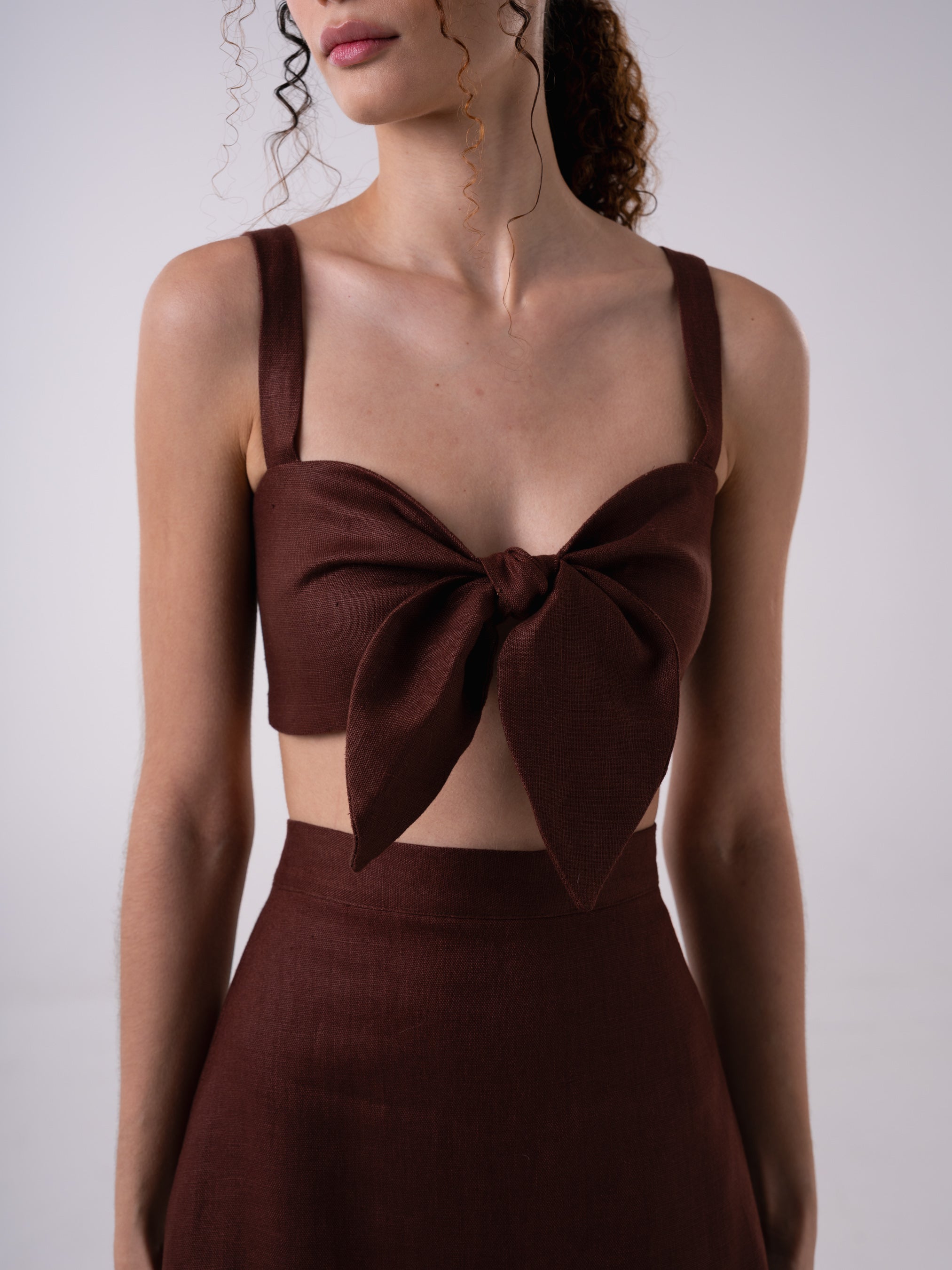 The Paena Top features a bandeau style top with oversized knot detail at the front, straps and button closure down the back.