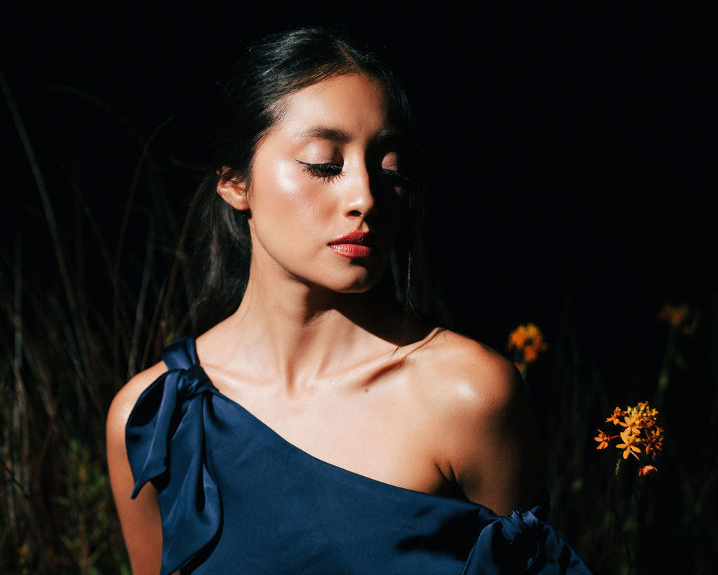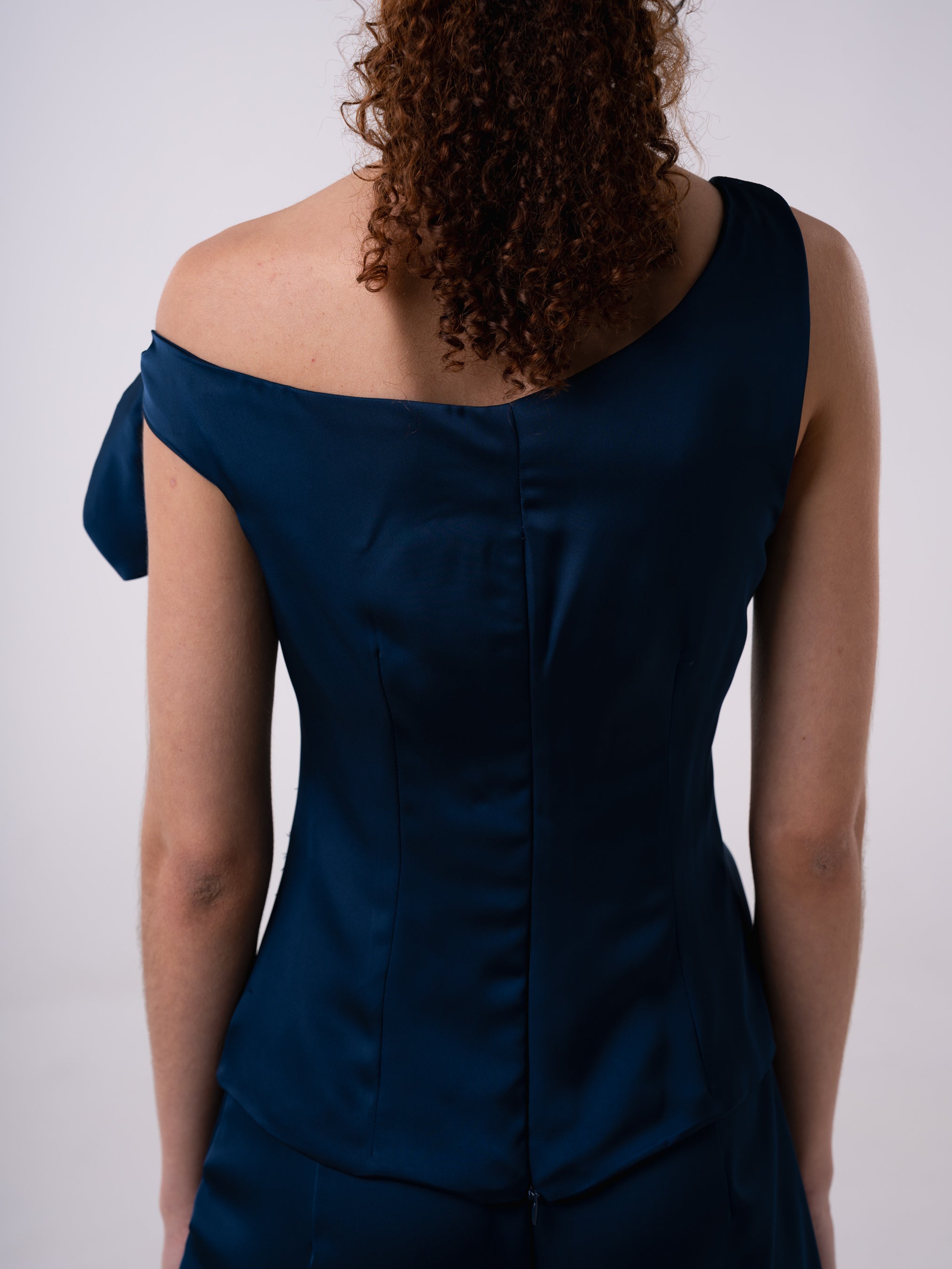 The Valle Top features a relaxed drop waist silhouette with single drop shoulder and petal knot detail.