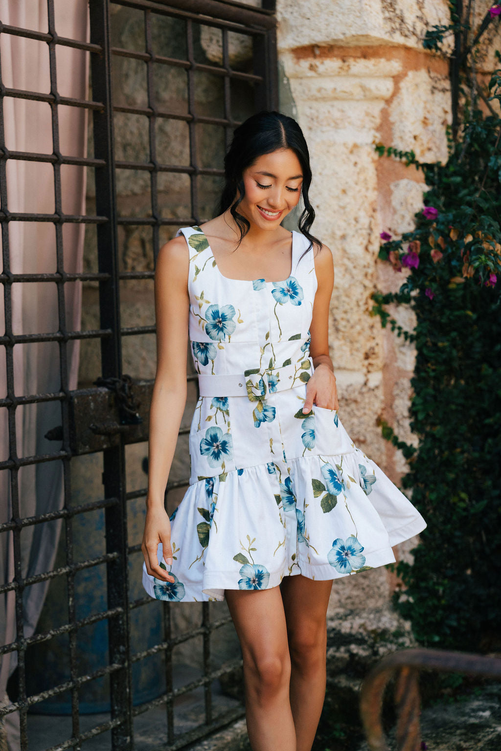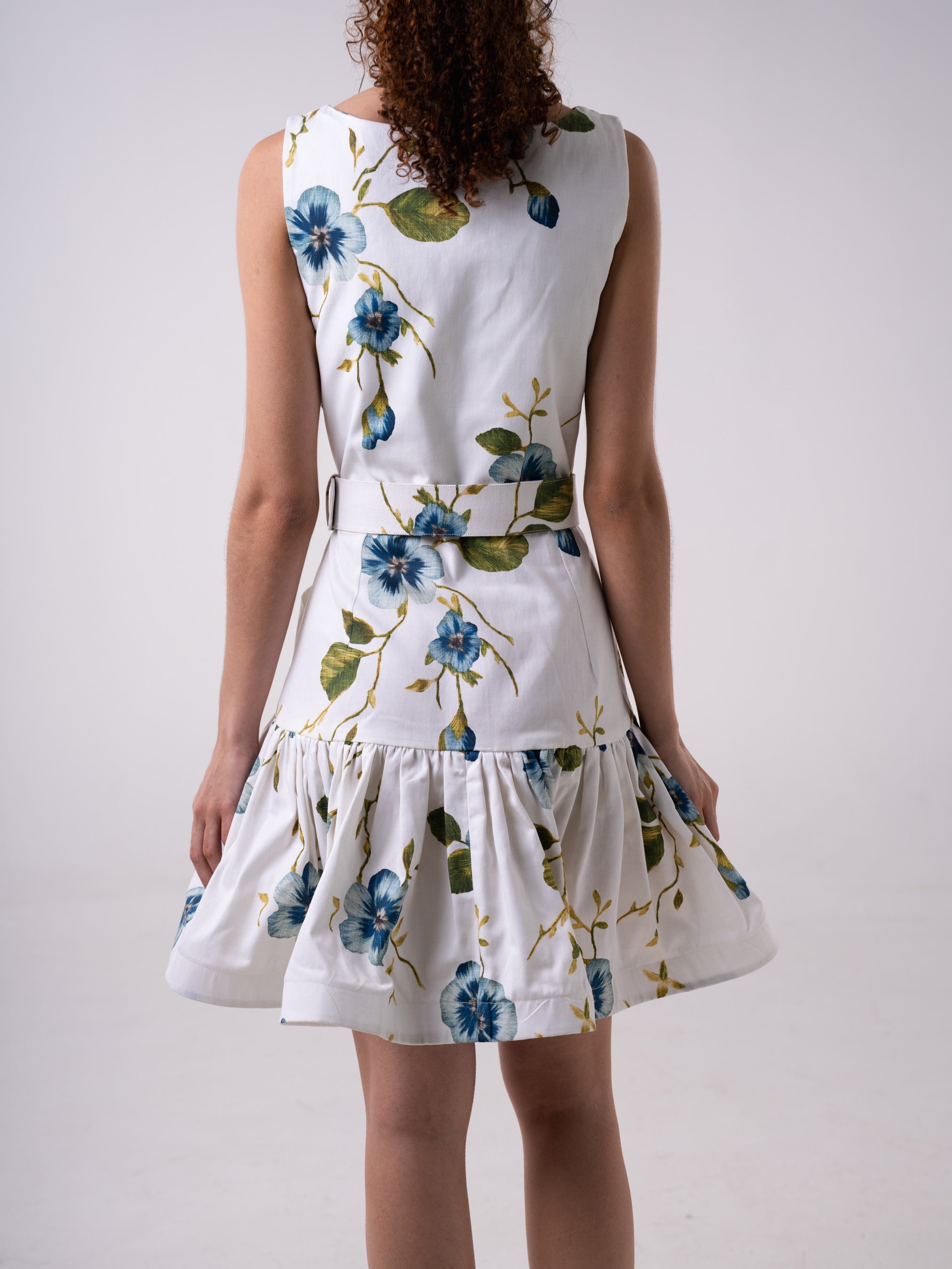 The Versailles Dress features a square neck above the knee, sleeveless dress with front button down closure and gathered skirt. Comes with matching waistband.