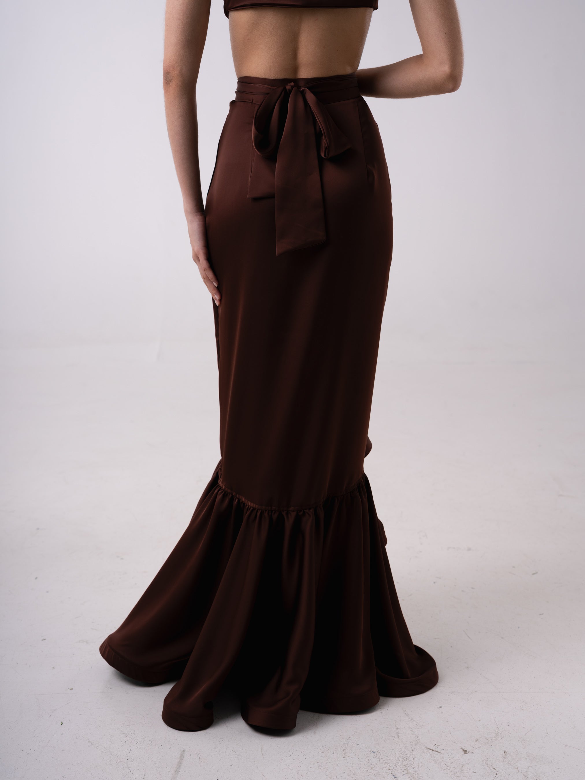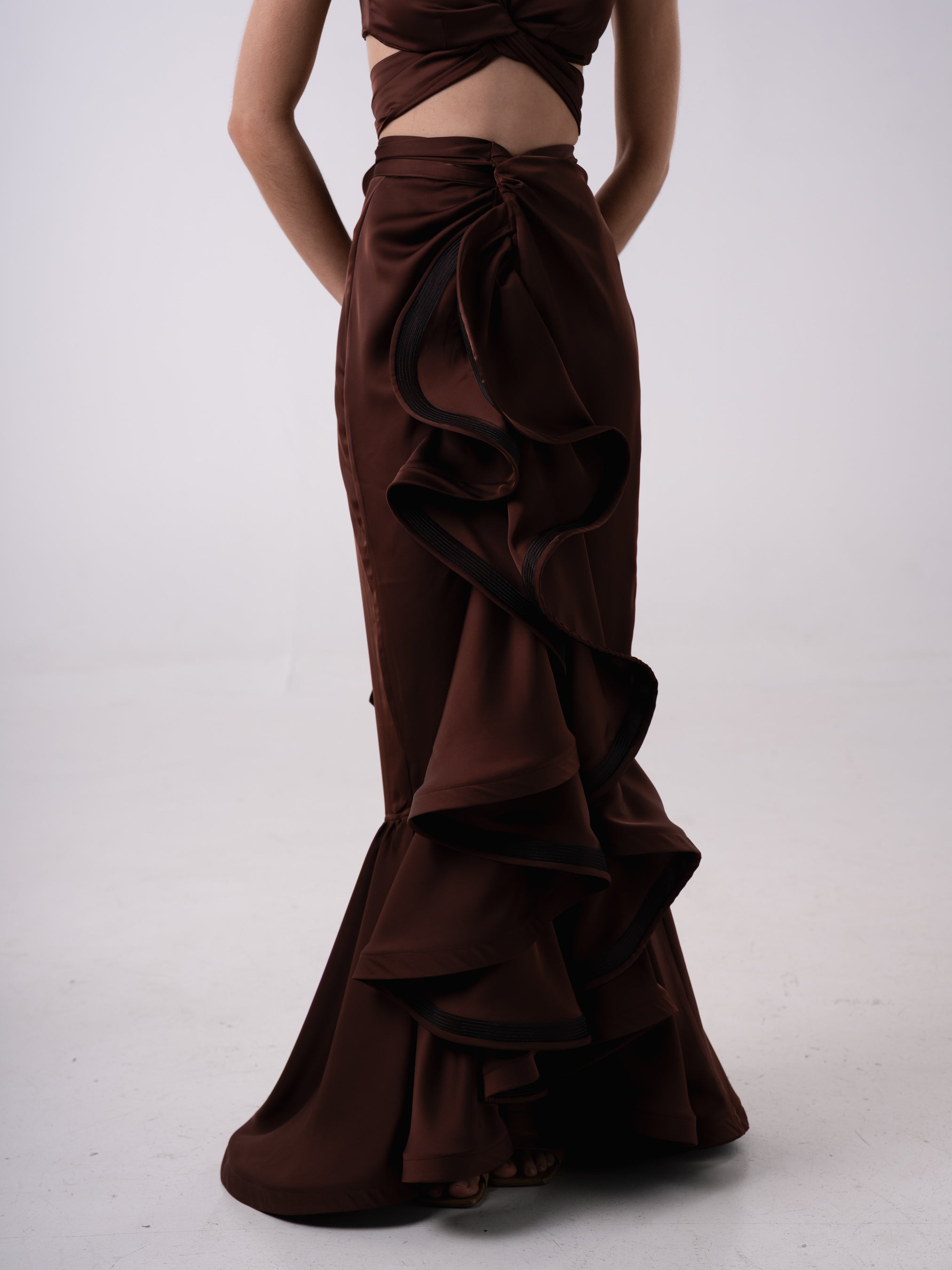 The Ciguapa Skirt features a wrap around floor length silhouette with circular ruffle down the center and hem.